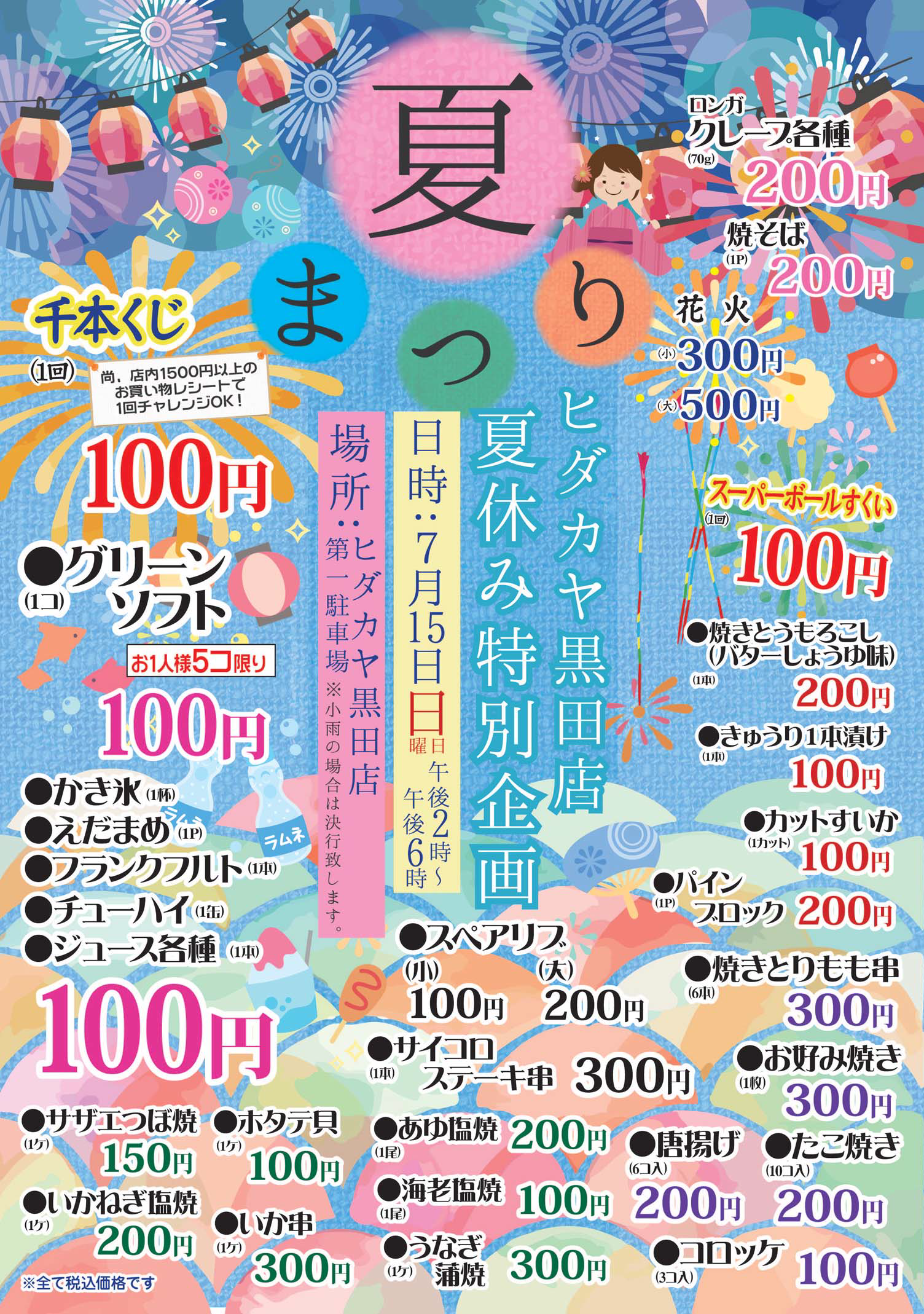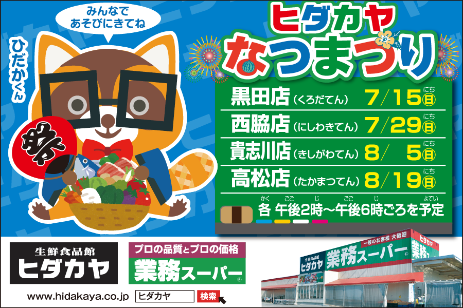 明日(7月29日)開催予定の西脇店夏祭りについて、台風接近により危険が伴うため、8月26日(日)に延期いたします。