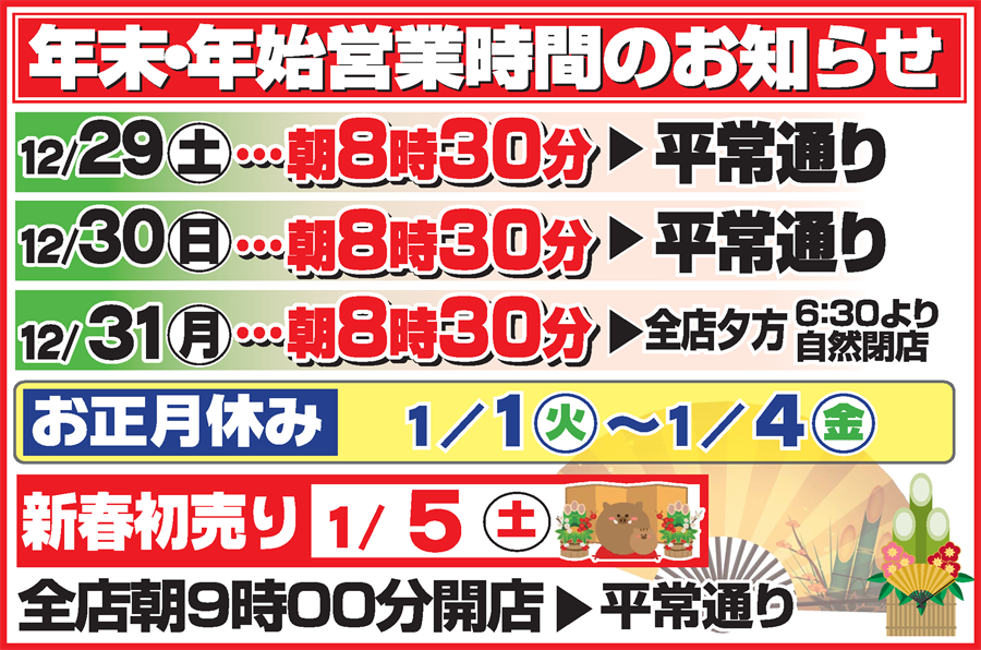 お正月の準備に忙しい年末に少しでも早く用事を済ませて頂けるよう、29日、30日、31日は、いつもより30分早く開店します。