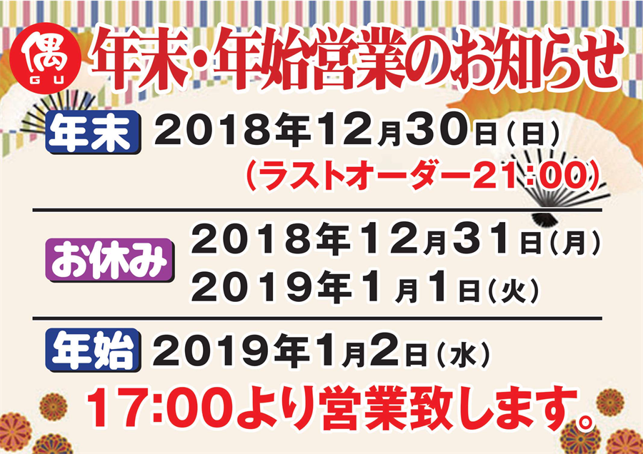 年末は12月30日まで、新年は1月2日の17時より営業いたします。