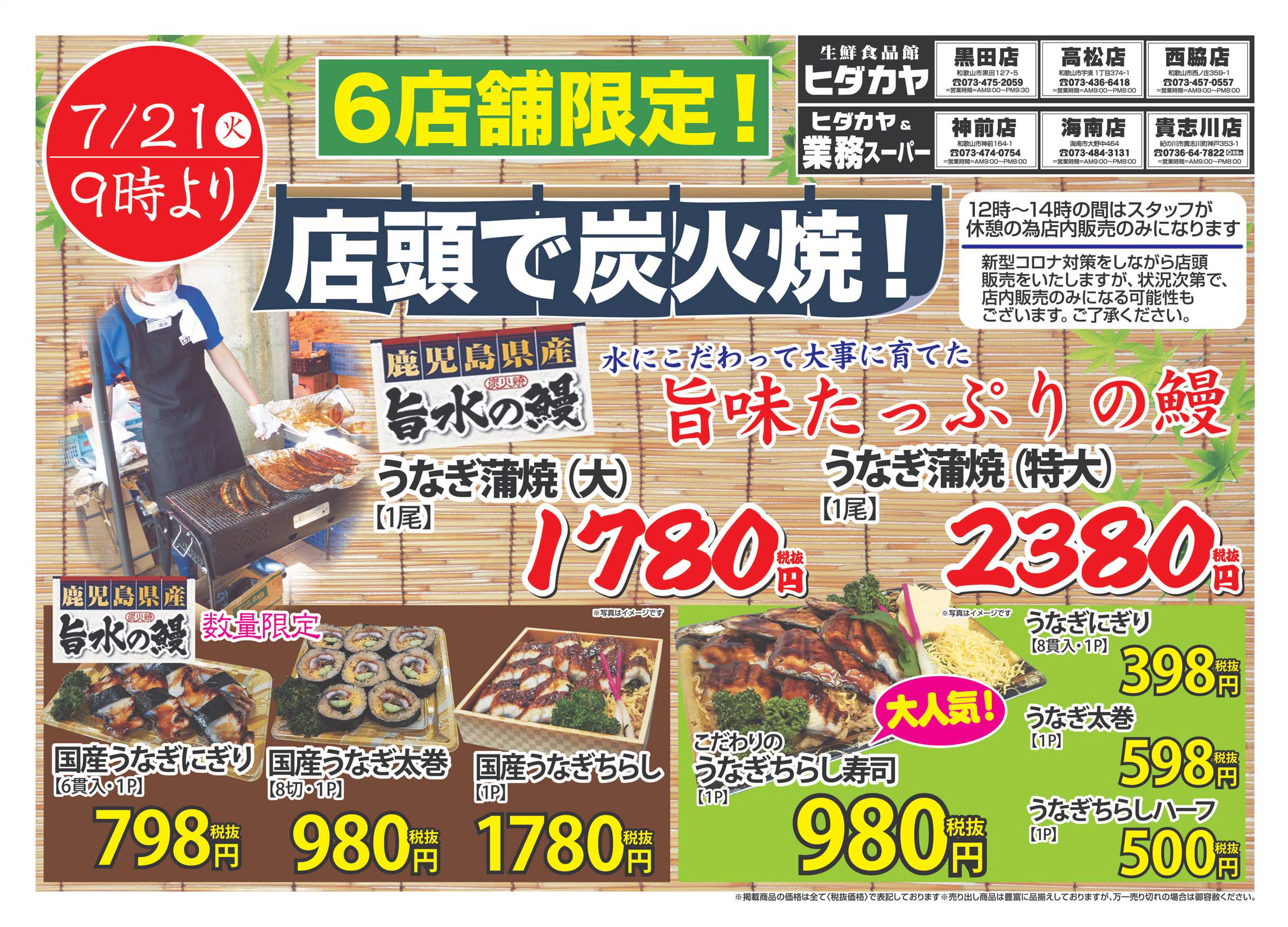 コロナ対策をおこなったうえで、今年も店頭で炭火焼販売をします!