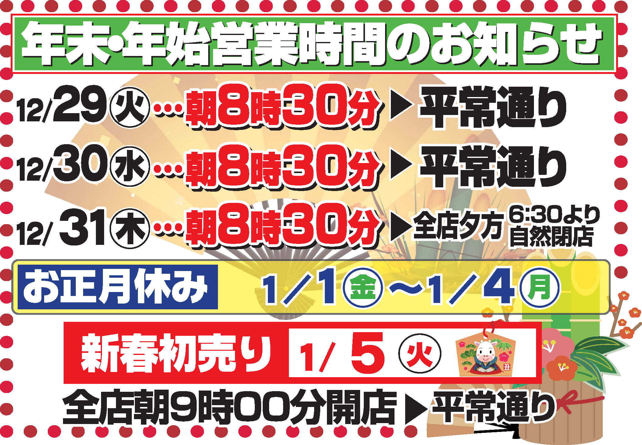 12月31日(木) 08:30~全店18:30より自然閉店
