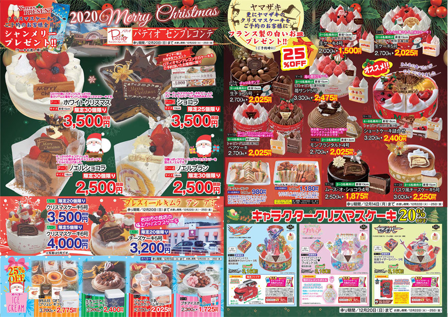 人気店「パティオセンプレコンテ」「プレズィールキムラアンアミ」のクリスマスケーキやお子様が喜ぶキャラクタークリスマスケーキなど多数ご用意!クリスマスケーキをご予約でご購入いただいたお客様全員にシャンメリーをプレゼントさせて頂いています♬