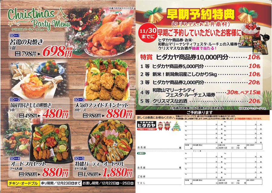 また11月30日までに早期にご予約して頂いたお客様にヒダカヤ商品券1万円分や新潟魚沼産こしひかりなどが抽選であたるチャンス!