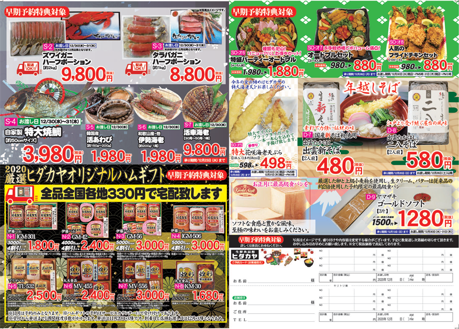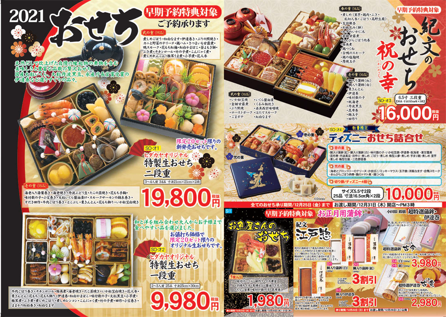 2021年は毎年大好評を頂いている「紀文のおせち」に加え「ヒダカヤオリジナル 特製生おせち」が新登場!天然だしで仕上げた煮物をはじめ、国産大粒いくら、大粒丹波黒豆、水産庁長官賞受賞の伊達巻など選りすぐりの品々がぎっしりつまった生おせちを限定各20セット限り、ご奉仕価格でご提供させていただきます!