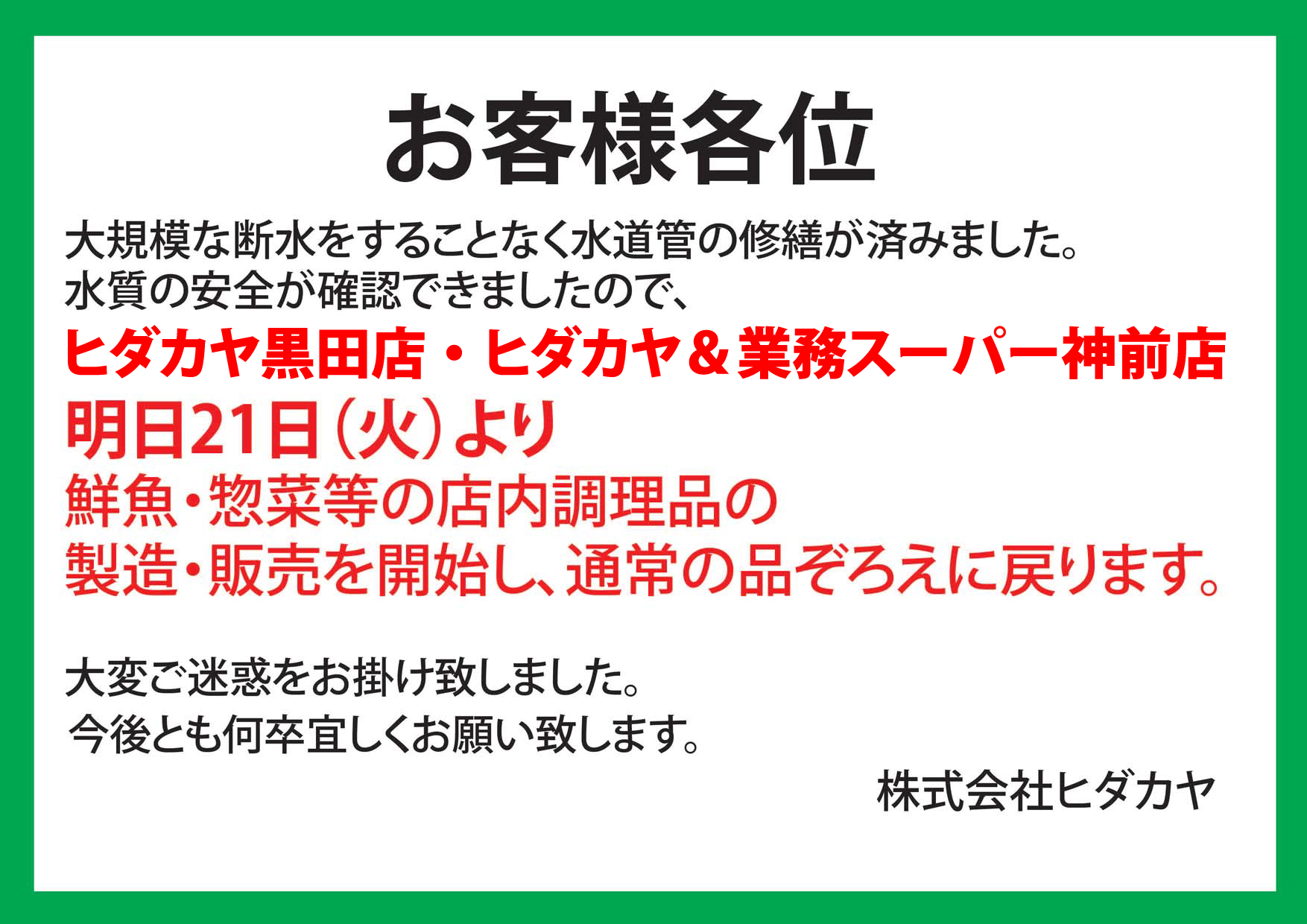 19日の営業は21時までとなります。20日以降の断水中は休業いたします。