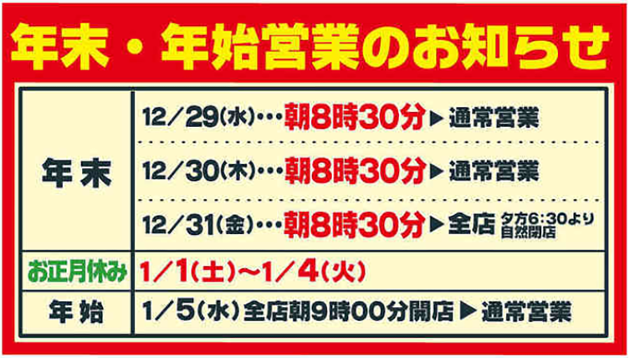 年末年始の営業時間を下記の通りご案内申し上げます。